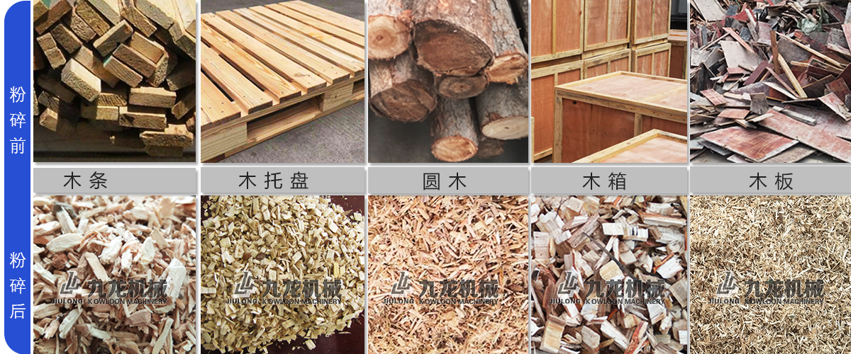 各种废旧木材、板材料、木托盘、下脚料、旧家具、木板、木箱等。现在粉碎木材和农作物的人越来越多,木材破碎后可以应用在电厂发电,制作香行业、能源棒的生产和菌菇生产养殖等等不同的领域。